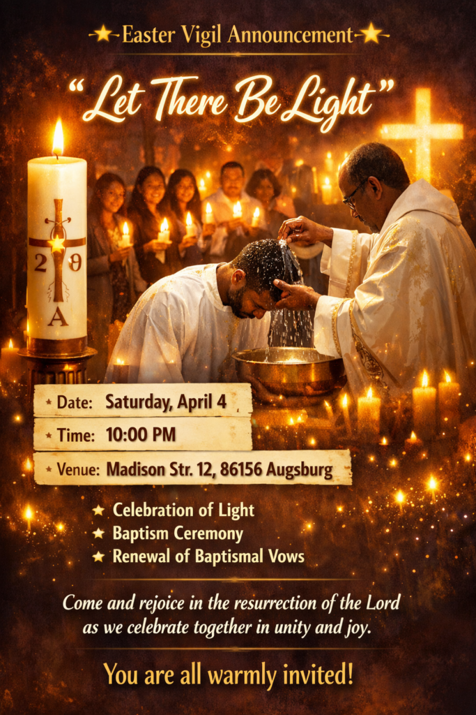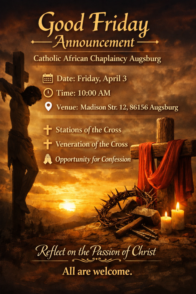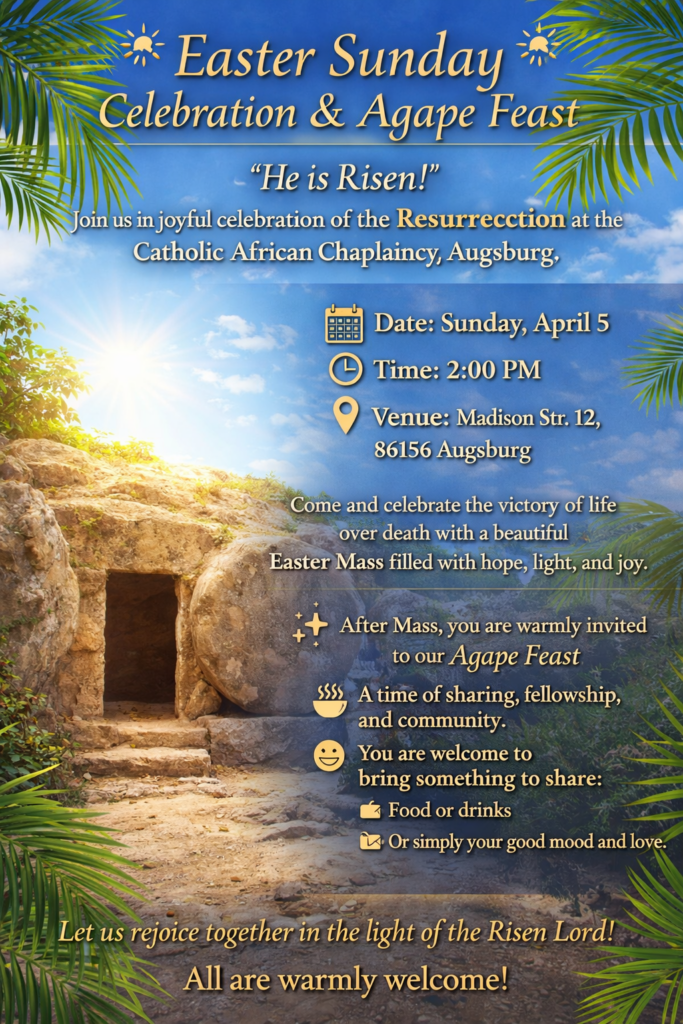 Gottesdienste in der Kar- und Osterwoche 2026 Veröffentlicht am 31. März 202631. März 2026 Natacha Nyonse BamyPosted in Aktuelles deutsch