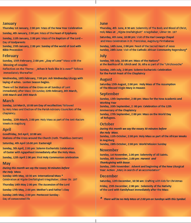 The programmes, activities and events outlined in this Annual Programme are therefore a warm invitation to every member of our Chaplaincy. I encourage all not to see this Programme merely as a schedule of events, but as a shared journey of faith, love and service. Each of us has something to offer — time, talents, commitment, prayer and solidarity. No contribution is too small, and no one is insignificant. Together, we become a home of hope and a family of love — for ourselves, our children and all whom God entrusts to us.